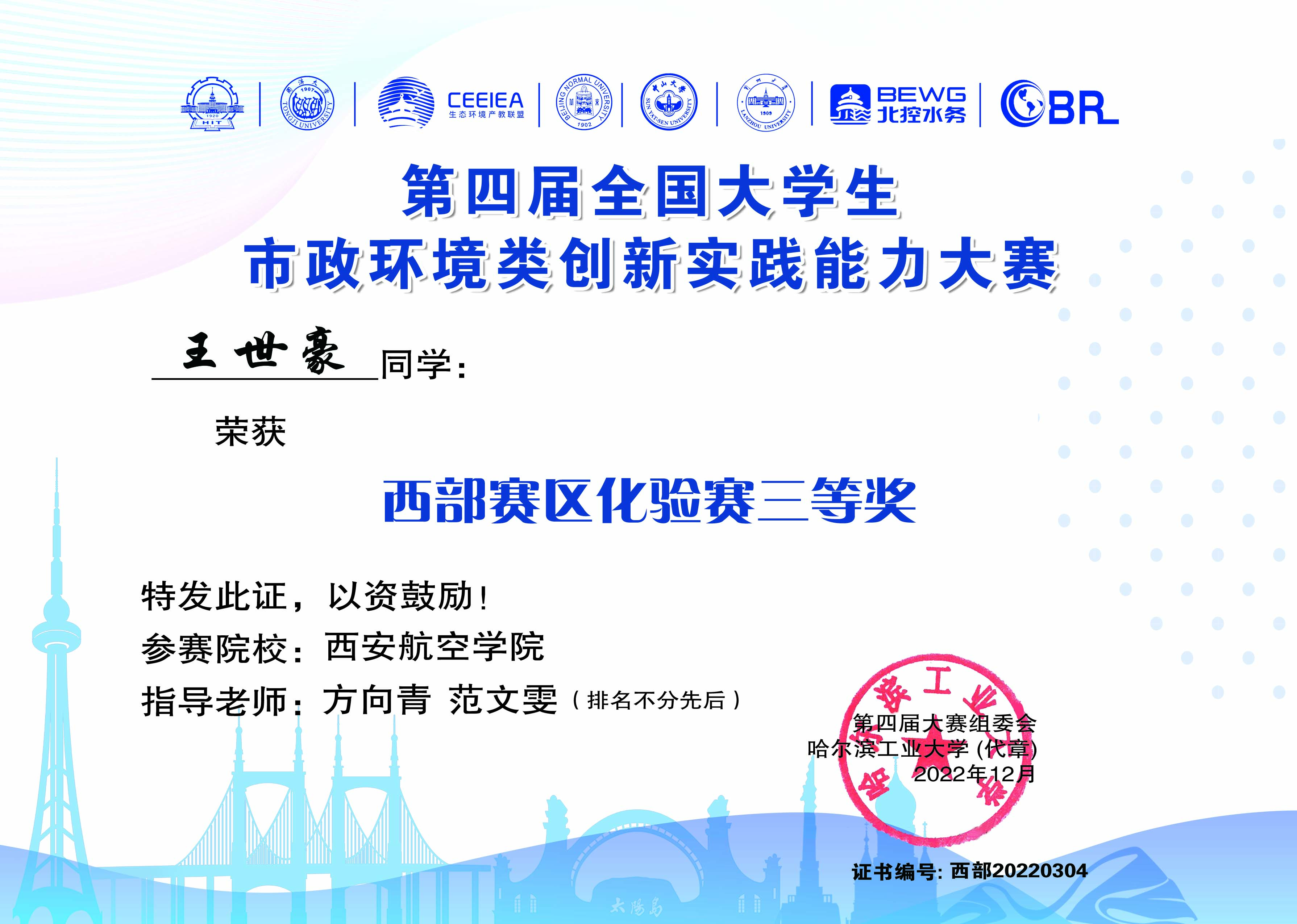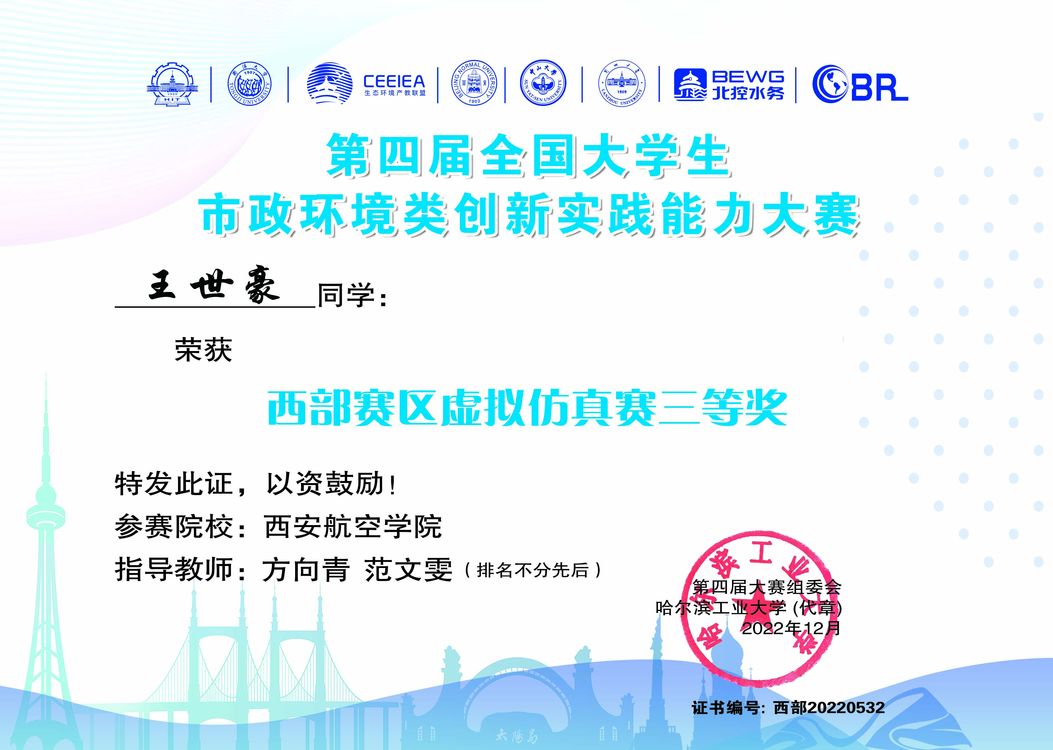 本届大赛由哈尔滨工业大学、同济大学和生态环境产教联盟共同主办,共有来自全国的147所高校,1423支队伍,4269名选手参加了此次大赛,贝博官网由能源与建筑学院教师指导的9名组成的3支队伍参加了比赛,经过激烈比拼,最终均取得较好成绩。