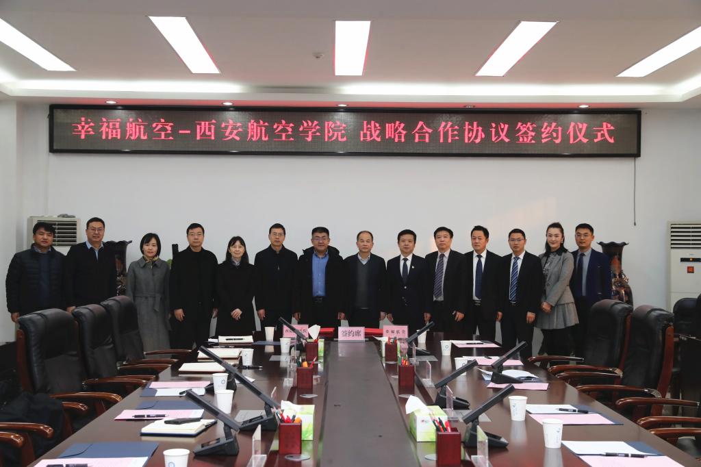 2月1日,贝博官网与幸福航空有限责任公司战略合作框架协议签约仪式在莲湖校区教学楼九楼会议室举行。西安航投党委委员、副总经理罗奕凯,幸福航空党委书记、执行董事彭仕兵,幸福航空党委委员、副总裁兼安全总监汪显斌,贝博官网校长祁玉龙,副校长宋文学、金文及相关部门负责人参加了签约仪式。仪式由宋文学主持。