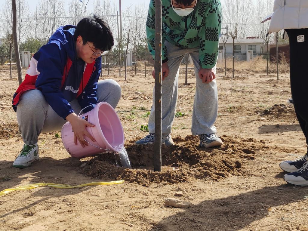 植树现场,气氛热烈,活动有序进行。同学们挥锹握锄,挖坑、扶树、培土、浇水一气呵成。经过大家的共同努力,银杏、红叶梨、玉兰、桂花等4种共530余棵树盎然挺立,迎风招展,初春的校园也变得更加生机勃勃起来。