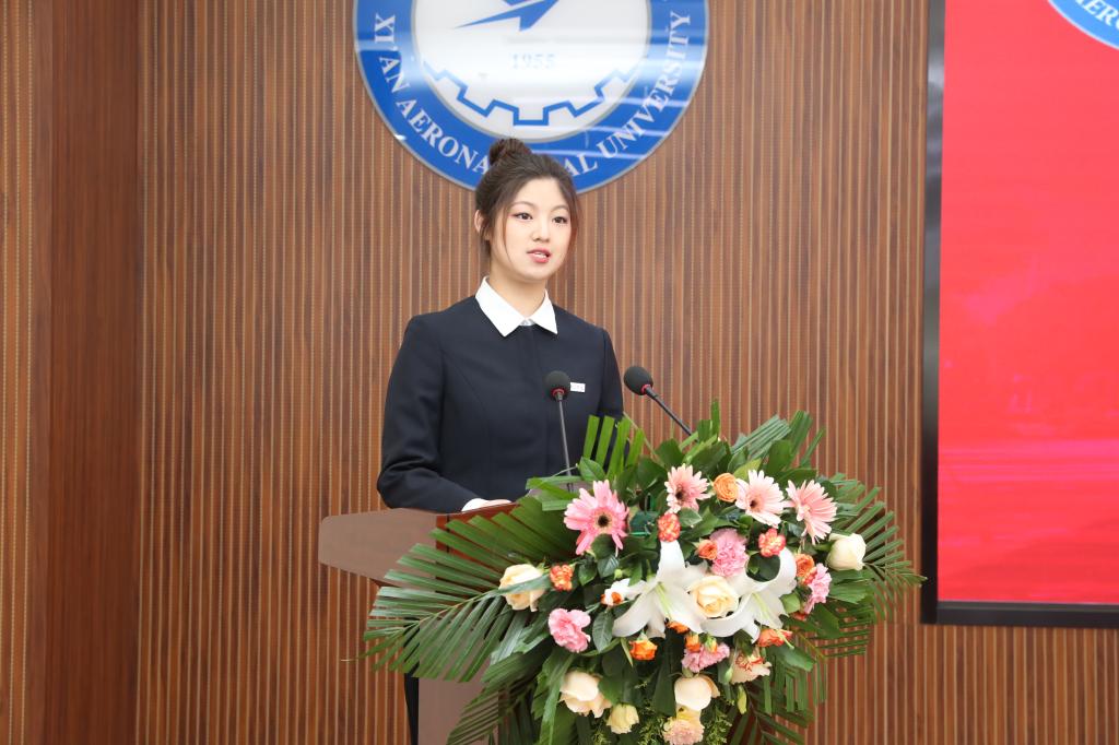 学生代表航空服务艺术与管理专业梁铭同学号召同学们在新的学院不负青春韶华,做有思想、有血肉、有信念的人。