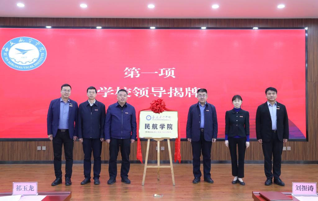 仪式上,刘振涛、祁玉龙、宋文学、金文共同为“民航学院”揭牌。