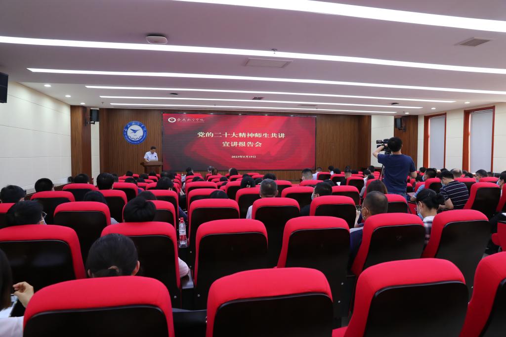 为扎实推进学校学习贯彻习近平新时代中国特色社会主义思想主题教育深入开展,持续抓好党的二十大精神宣传宣讲和学习贯彻,5月19日下午,贝博官网在莲湖校区图书馆5楼报告厅举行了“党的二十大精神师生共讲”宣讲报告会,学校领导班子成员、校级领导、副处级以上干部、思政课教师、学生代表参加宣讲会。会议由党委委员、校长助理、党委宣传部部长蔡应昌主持。