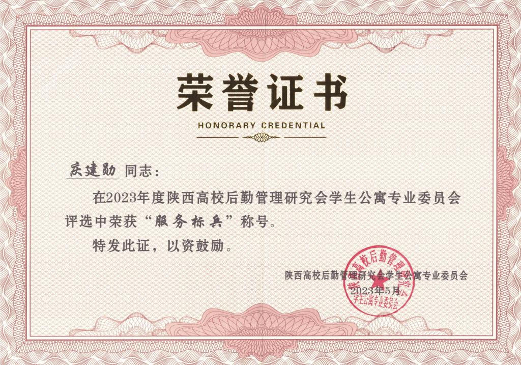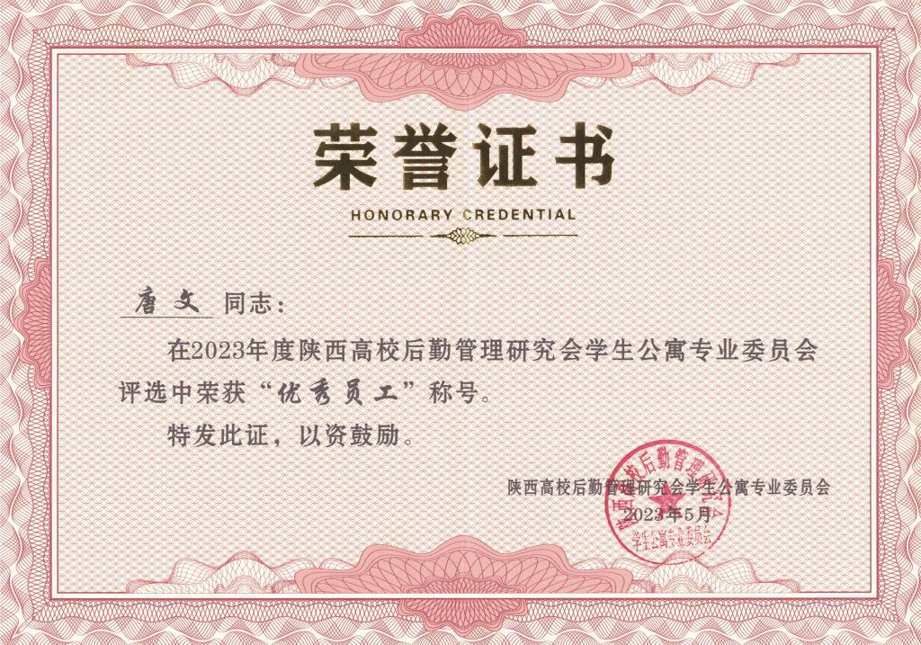 5月26日,由陕西高校后勤管理研究会学生公寓专业委员会主办的“陕西高校学生公寓专业委员会2023年年会暨成立30周年庆典”在西安举行。大会表彰了2023年度陕西高校学生公寓先进集体、优秀员工、服务标兵等。贝博官网后勤保障处公寓管理中心荣获“陕西高校学生公寓先进集体”荣誉称号;公寓管理中心唐文同志荣获“陕西高校学生公寓优秀员工”荣誉称号;公寓管理中心庆建勋同志被评为“陕西高校学生公寓服务标兵”荣誉称号。