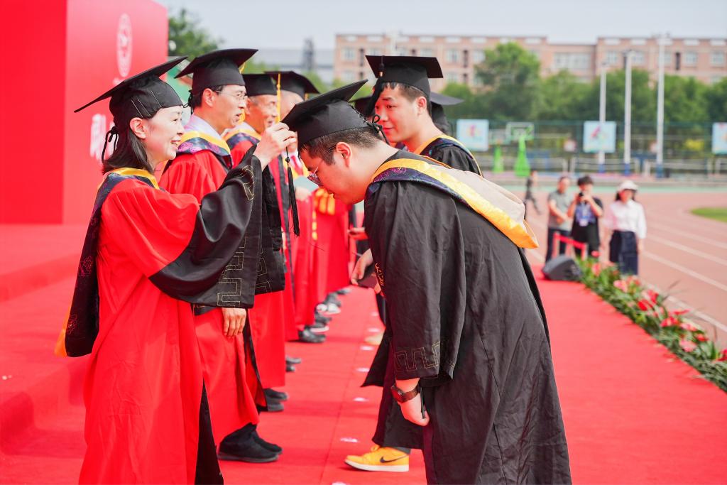 校领导为获得学士学位的2023届本科毕业生代表一一扶正流苏、颁发学位证书,并与大家亲切握手,表达祝贺,合影留念。