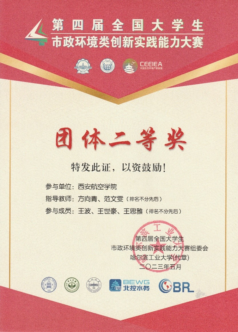 近日,由哈尔滨工业大学、同济大学和生态环境产教联盟共同主办的第四届全国大学生市政环境类创新实践能力大赛圆满落幕,贝博官网王波、王世、王思雅三位同学组成的西航飞跃队荣获团体二等奖。