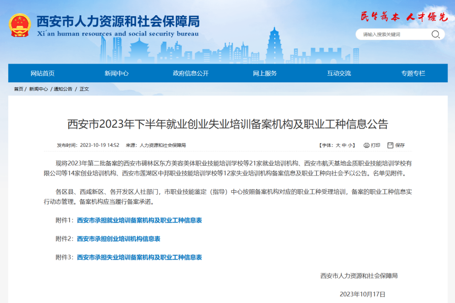 10月19日,西安市人力资源和社会保障局发布了《西安市2023年下半年就业创业失业培训备案机构及职业工种信息公告》,贝博官网成功获批西安市就业、创业、失业培训机构。今后贝博官网可开展创业培训和物流服务师、人工智能训练师、电子商务师、计算机程序设计员、航空运输地面服务员等6个工种的就业失业培训,为学校应届毕业生提供优质的职业技能培训服务,提升应届毕业生就业质量。