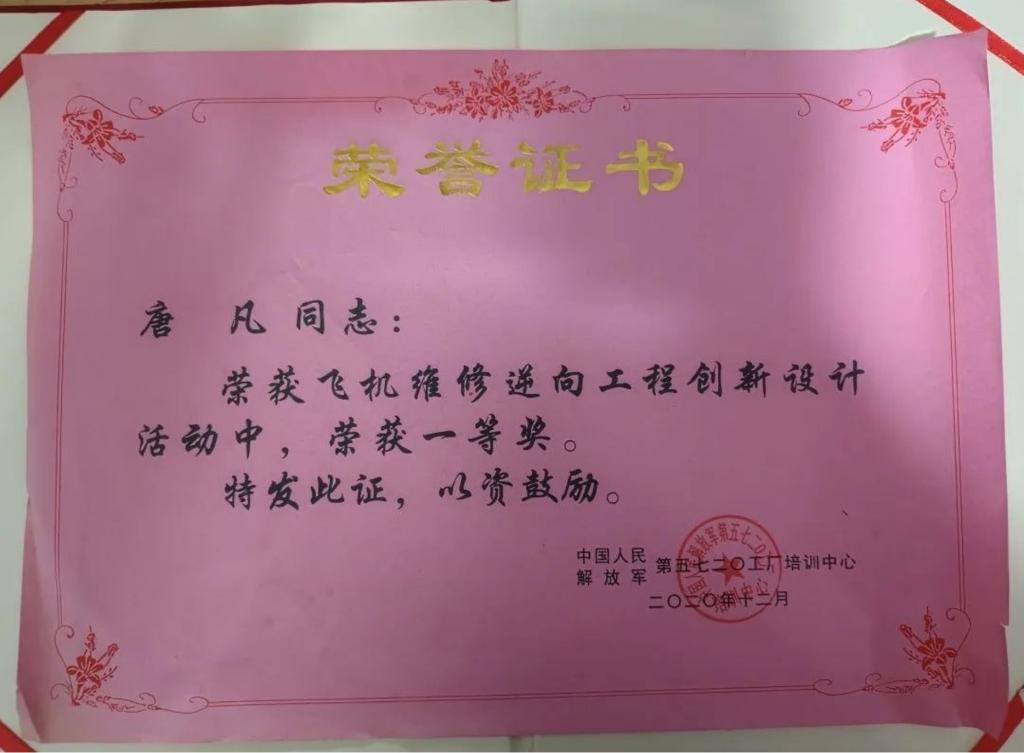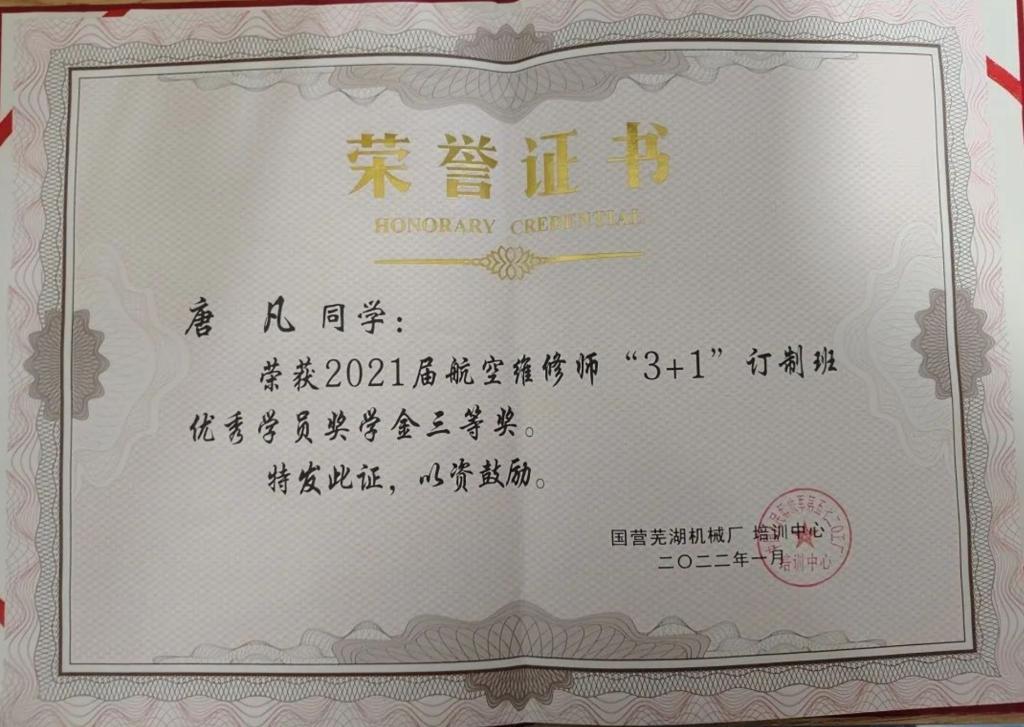 2020年,唐凡面试通过成为国营芜湖机械厂首届“3+1”定制班的一员,11月离开学校,随工厂第一届“3+1”定制班进入国营芜湖机械厂学习,在班内团结同学,认真学习,并抽空积极完成大学毕业设计顺利毕业。在理论方面,认真学习工厂文化,以优异的成绩通过了工厂岗位资格考试,并积极学习CATIA,取得了工厂飞机维修逆向工程创新设计活动的一等奖。在实训方面,脚踏实地刻苦练习,取得了优秀的实操成绩。最终被评为从“3+1”定制班优秀学员。